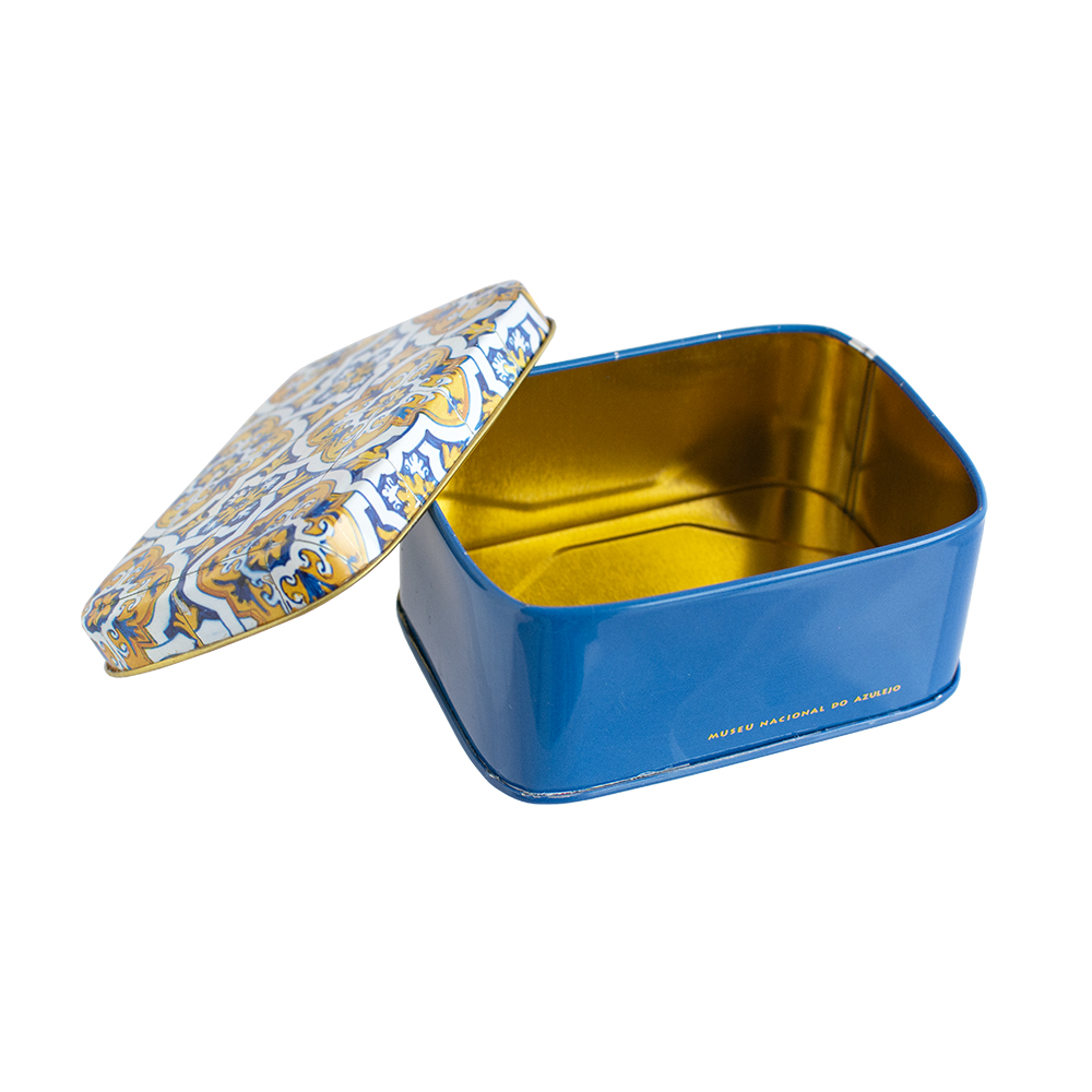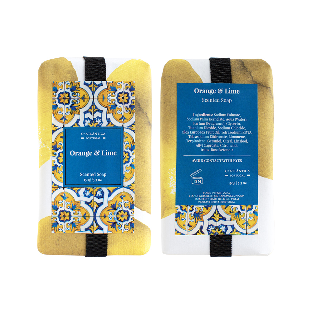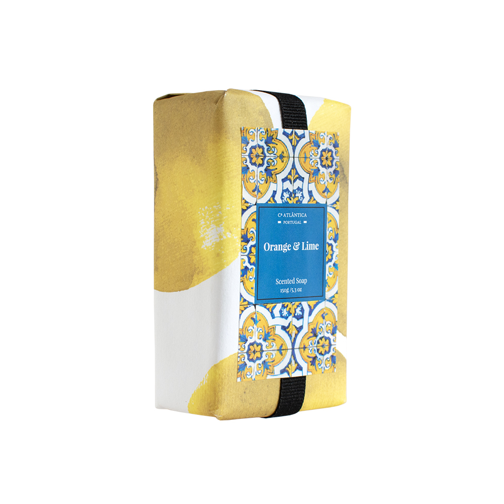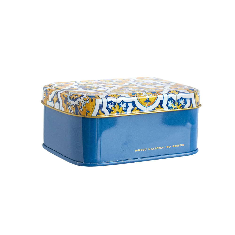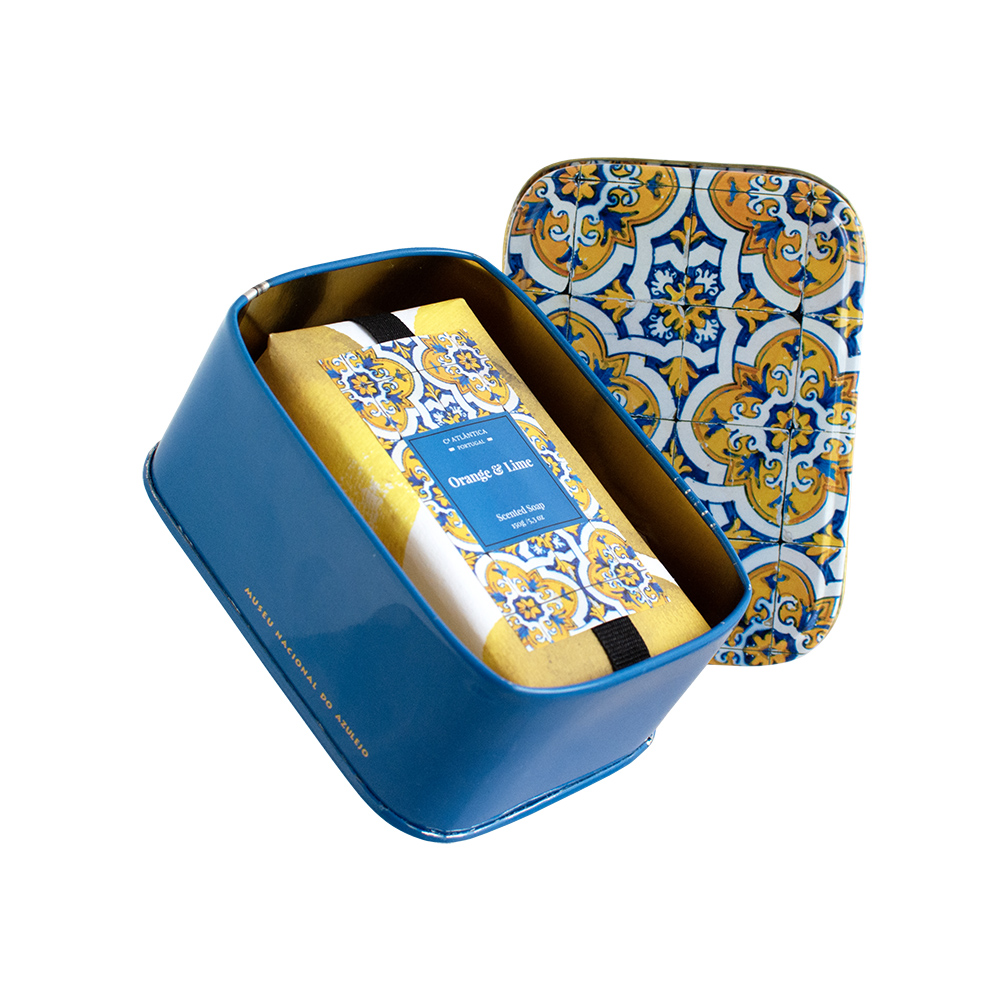Sabonete retangular com perfume a laranja e lima, em embalagem de lata inspirada nos azulejos portugueses.