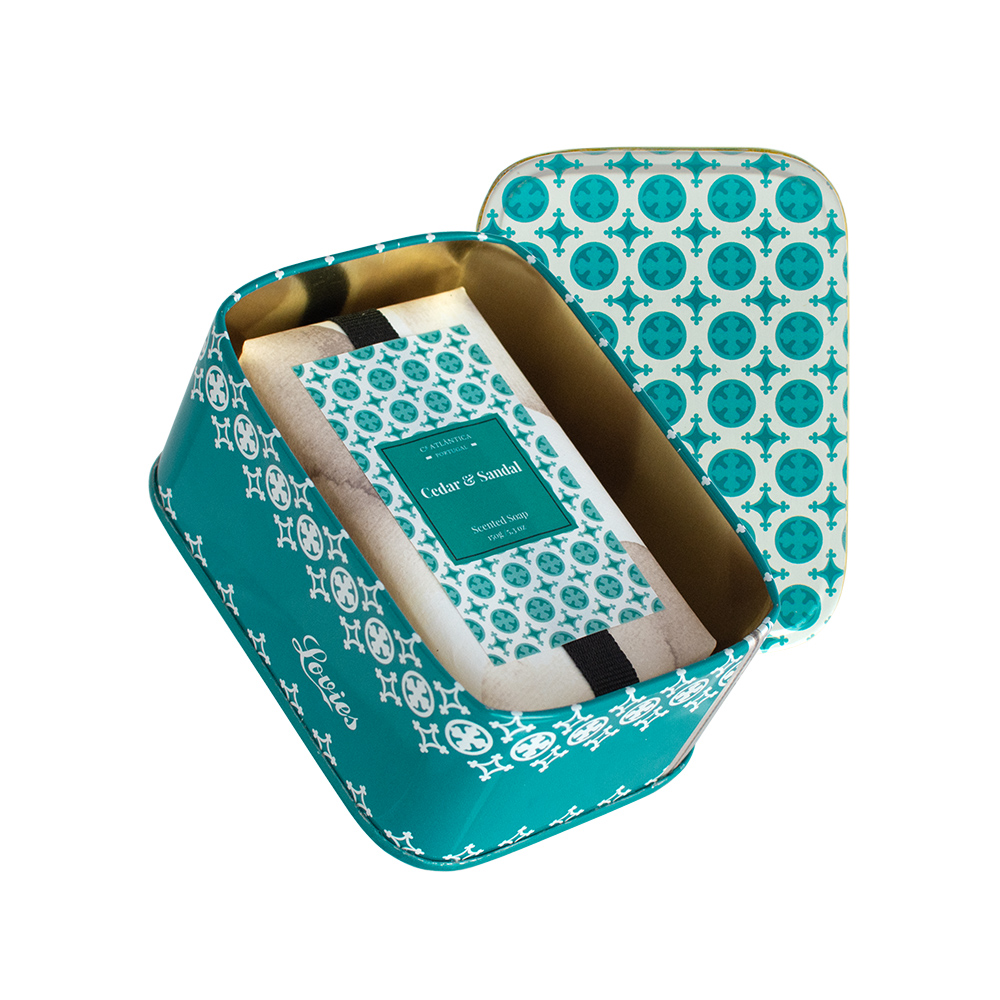 Sabonete retangular com perfume a cedro e sândalo, em embalagem de lata inspirada nos azulejos portugueses.
