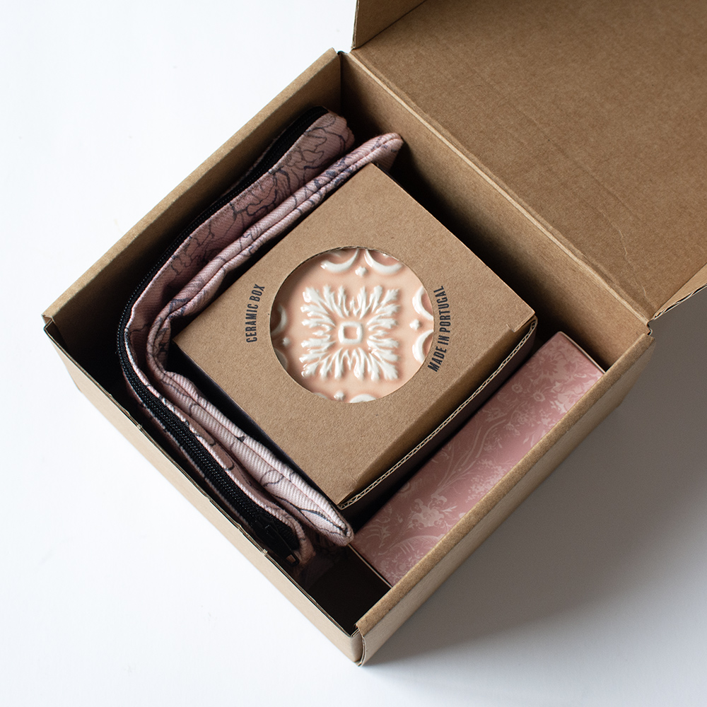 Caixa quadrada para jóias rosa nude, em cerâmica decorada à mão com motivo de azulejo português em alto relevo. Feito em Portugal.