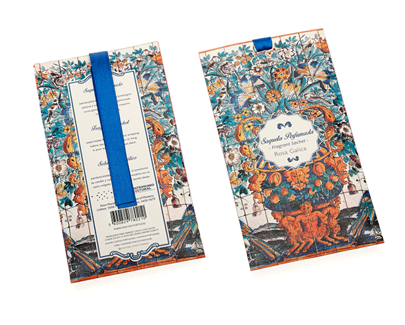 Saqueta perfumada com um suave e delicado perfume de rosa, decorado com um invólucro inspirado num painel do Convento de Nossa Senhora da Esperança, em Lisboa, representando um vaso florido. Tem detalhe de fita de cetim e é feito com cortiça portuguesa para melhor absorção e libertação de forma lenta e prolongada do perfume.
