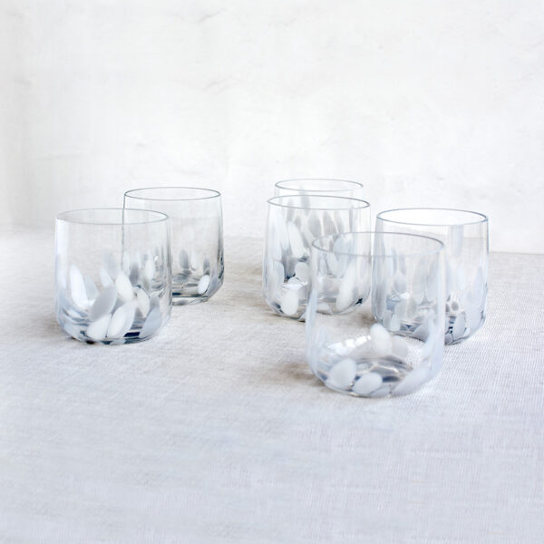 Além dos copos em vidro transparente, temos os copos em vidro soprado manual produzidos com a técnica de britado. As cores vibrantes e os padrões irregulares do britado criam um efeito visual deslumbrante, que transforma cada peça em uma obra de arte única.